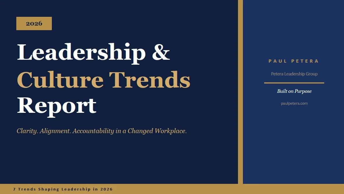 Paul Petera spent 30 years as a risk management executive in financial services before writing Built on Purpose: Lessons in Leadership and Culture — a 2025 Firebird Book Award winner and American Writing Awards finalist. This report is drawn from the principles in that book, updated for the forces reshaping leadership today. It's practical, direct, and designed to be useful the day you read it.